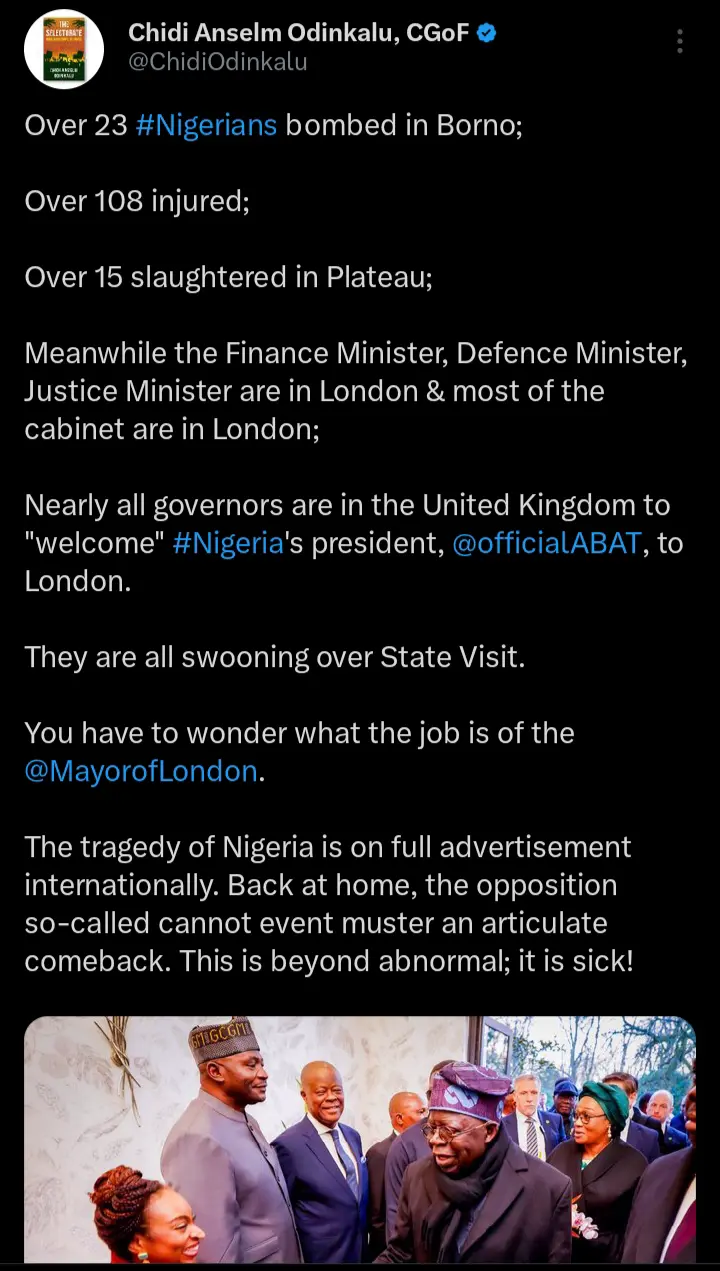 While all these tragedies happened, according to Chidi Odinkalu, nearly all ministers and governors were in the United Kingdom to welcome president Tinubu….See More