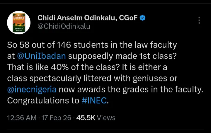 Chidi Odinkalu, a renowned human rights activist and legal practitioner has taken to his official X handle to react after it was announced that a large number of students made first class from the law faculty in University of Ibadan, Oyo State. According to the statements which were shared on his official X handle, he dragged INEC into the conversation.