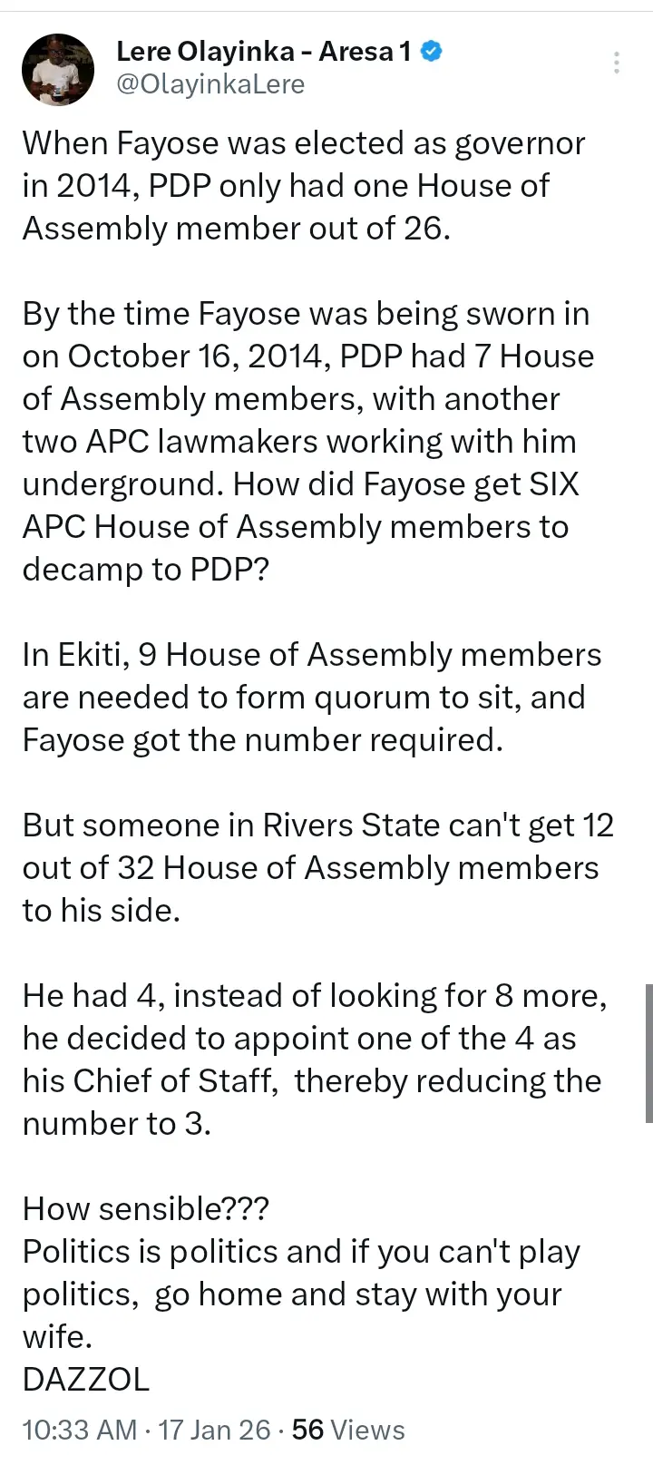 In his words, “In Ekiti, 9 House of Assembly members are needed to form quorum to sit, and Fayose got the number required. But someone in Rivers State can’t get 12 out of 32 House of Assembly members to his side.”
