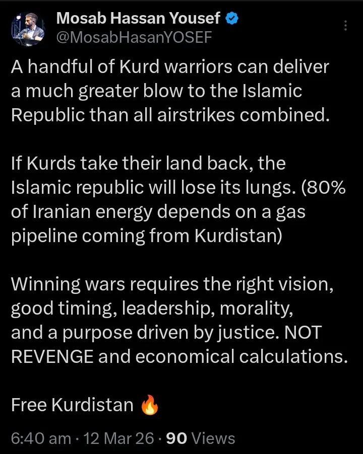 Mosab Hassan Yousef, an American author and former militant who defected to Israel, has made a strong statement about the role of Kurdish fighters in challenging the Islamic Republic of Iran.