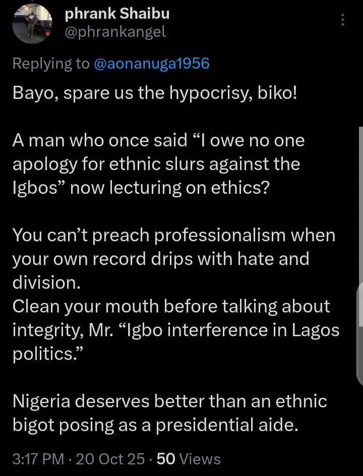 In his response on X, Shaibu directly referenced a previous controversy, stating, “A man who once said ‘I owe no one apology for ethnic slurs against the Igbos’ now lecturing on ethics?” He concluded that Onanuga’s own record, which he characterized as dripping “with hate and division,” disqualified him from preaching about professionalism.