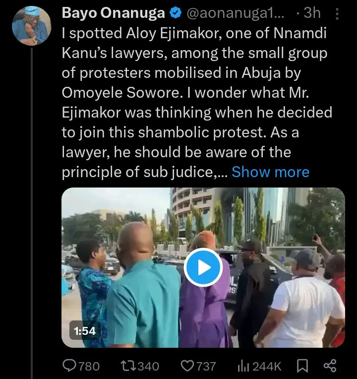 The dispute was triggered by Ejimakor’s involvement in a peaceful demonstration in Abuja, which was organized by activist Omoyele Sowore. In a post on his official X account, Onanuga questioned Ejimakor’s professional ethics, describing his actions as unethical and explicitly urging legal authorities to impose sanctions on the “bearded lawyer.”