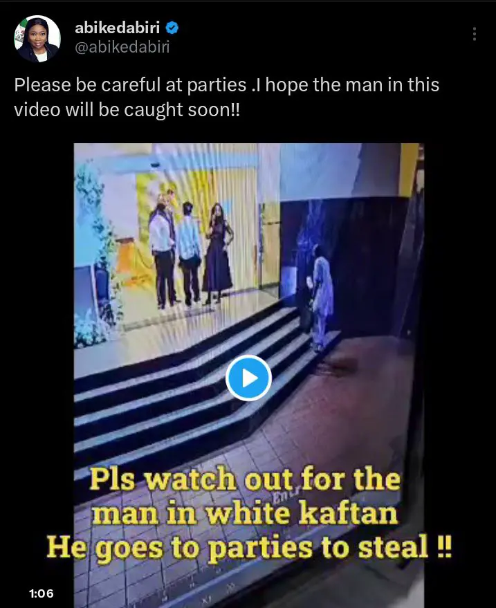 The incident was shared on Dabiri’s official X (formerly Twitter) handle on January 1, 2026. According to the video, the man reportedly enters parties confidently, sits calmly among guests, and carefully observes his surroundings before carrying out his act. He was eventually captured on a CCTV camera while committing the crime, exposing his method of operation.