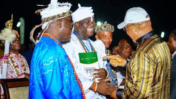 The executive Governor of Akwa Ibom State and chieftain of the All Progressives Congress, Pastor Umo Eno has been pictured together with Ooni of Ife, Oba Adeyeye Enitan Ogunwusi at the State Christmas Carols Festival in Uyo on Friday.
