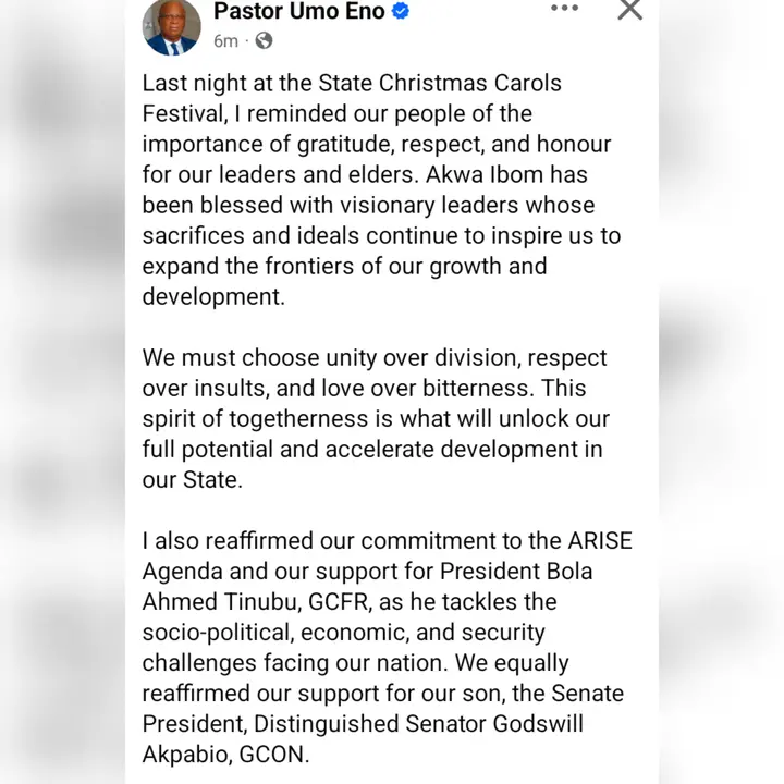 The executive Governor of Akwa Ibom State and chieftain of the All Progressives Congress, Pastor Umo Eno stated on his verified Facebook page on Saturday; “Last night at the State Christmas Carols Festival, I reminded our people of the importance of gratitude, respect, and honour for our leaders and elders.”