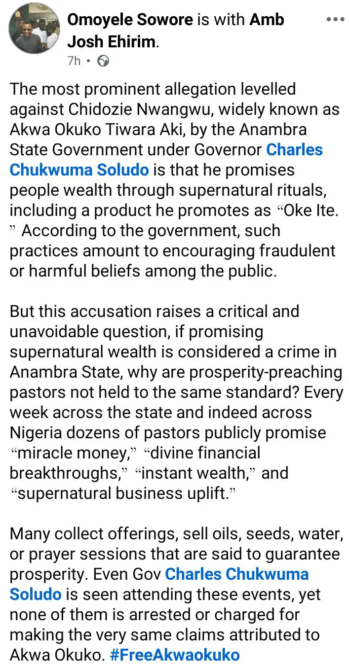 A recent statement shared by human rights activist Omoyele Sowore on his verified Facebook page has sparked renewed debate over the Anambra State Government’s handling of allegations against Chidozie Nwangwu, popularly known as Akwa Okuko Tiwaraki. According to the government, Nwangwu is accused of promoting supernatural rituals and promising wealth through mystical means, including a product referred to as Oke Ite. Authorities argue that such practices encourage fraudulent or harmful beliefs among the public.