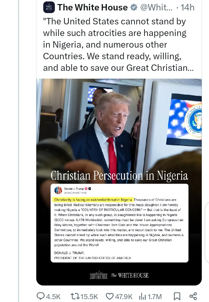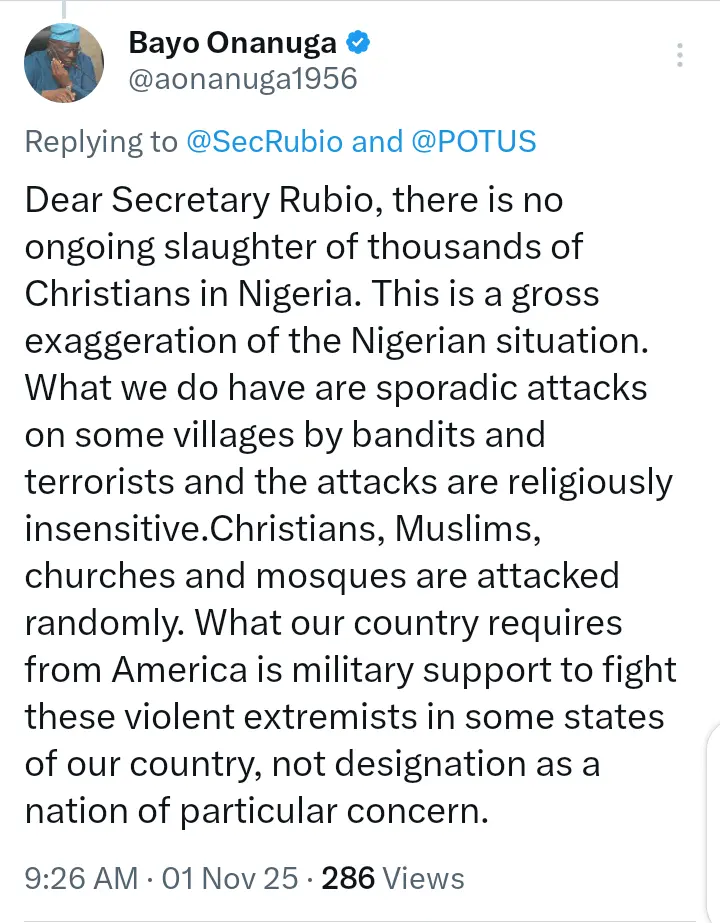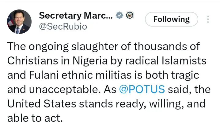 “Dear Secretary Rubio, there is no ongoing slaughter of thousands of Christians in Nigeria. This is a gross exaggeration of the Nigerian situation. What we do have are sporadic attacks on some villages by bandits and terrorists and the attacks are religiously insensitive. Christians, Muslims, churches and mosques are attacked randomly”.