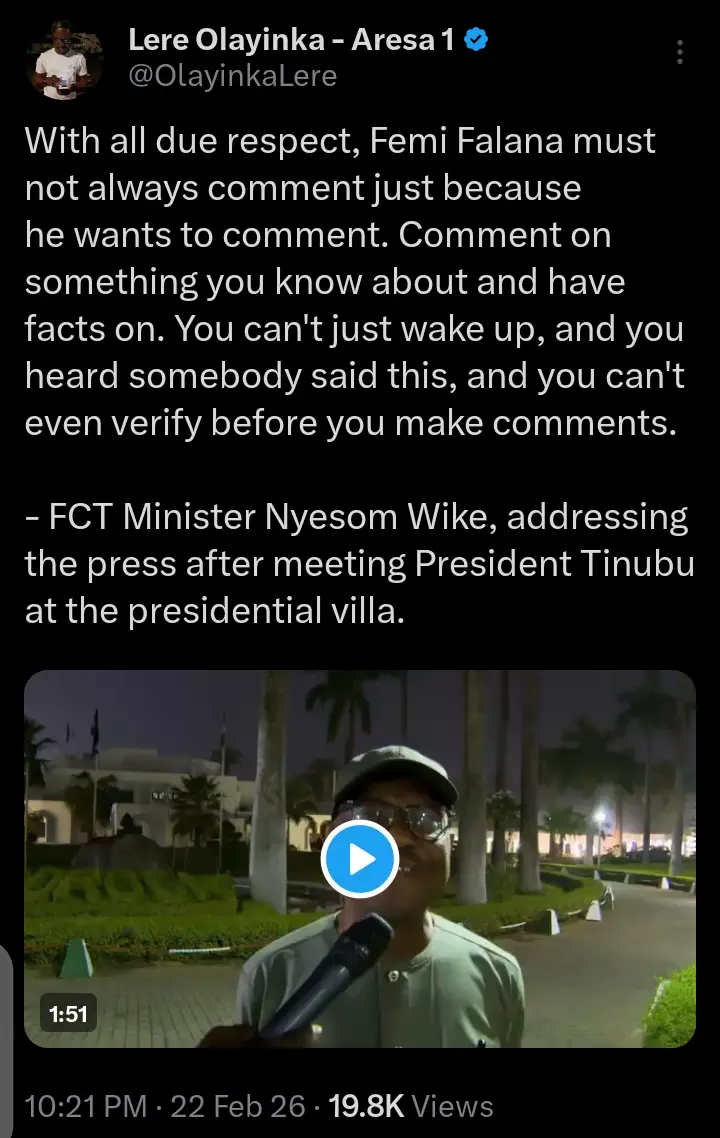 A video that was posted on the official X account of Lere Olayinka, the Senior Special Assistant on Public Communication and Social media to the former governor of Rivers state and FCT Minister, Nyesom Wike has captured the moment the FCT Minister was telling Senior Advocate of Nigeria, Femi Falana to stop commenting on every issue.