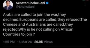In his words, Sani wrote, “Arabs are called to join the war, they declined. Europeans are called, they refused. The Chinese and Australians are called, they rejected. Why is he not calling on African Countries to join?”