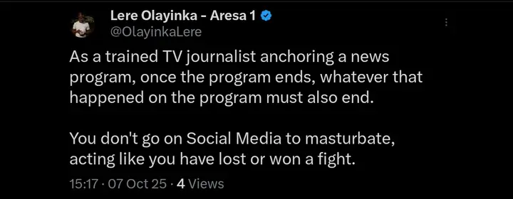 He wrote: “As a trained TV journalist anchoring a news program, once the program ends, whatever that happened on the program must also end. You don’t go on Social Media to masturbate, acting like you have lost or won a fight.”