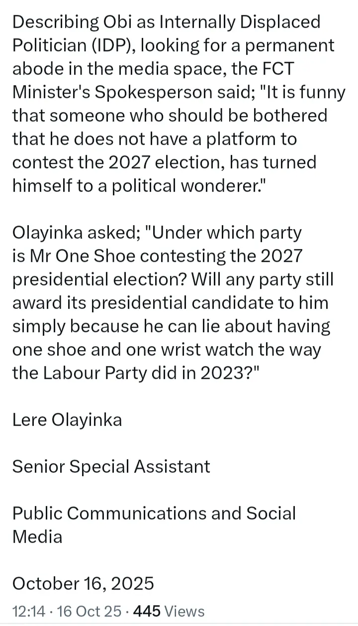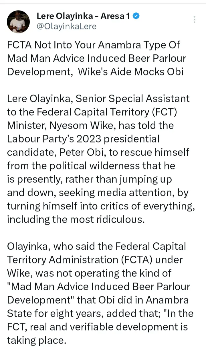 Lere Olayinka, spokesperson for the Federal Capital Territory (FCT) Minister Nyesom Wike, has again criticized Peter Obi, the Labour Party’s 2023 presidential candidate and former governor of Anambra State over his comment as regards educational infrastructure in the FCT.