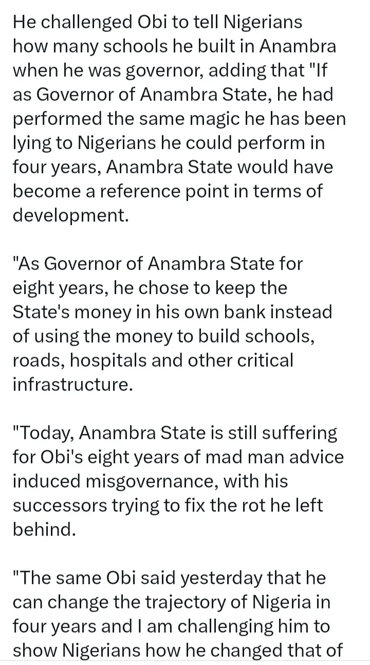 Olayinka wrote, “As Governor of Anambra State for eight years, he chose to keep the State’s money in his own bank, instead of using the money to build schools, roads, hospitals and other critical infrastructure. Today, Anambra State is still suffering for Obi’s eight years of mad man advice induced misgovernance, with his successors trying to fix the rot he left behind.”