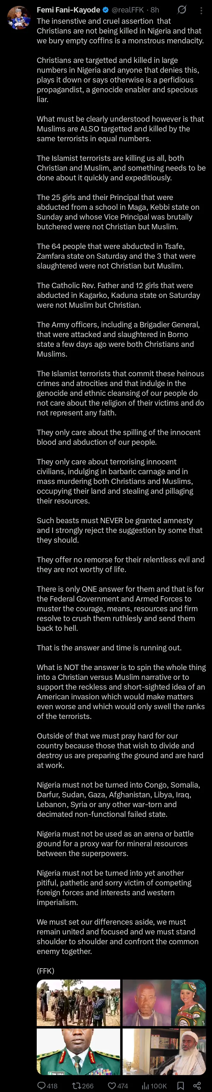 In his post, Fani-Kayode said Nigerians must understand that terrorists are attacking all citizens, regardless of religion.