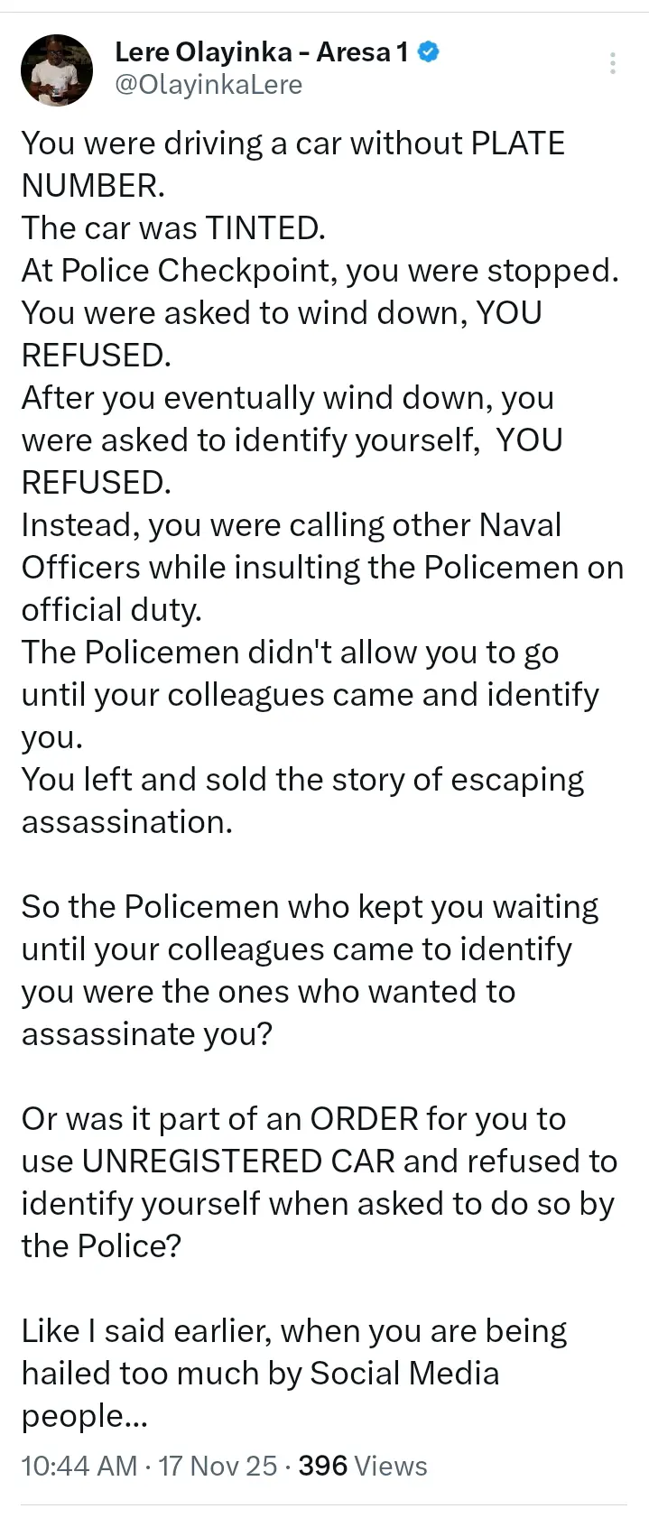 Lere Olayinka has criticised the growing online narrative surrounding naval officer Lt. Ahmed Yerima, saying the story being pushed on social media leaves out important details. His reaction came after the Federal Capital Territory Police Command dismissed claims that the officer survived an attempted assassination in Abuja.