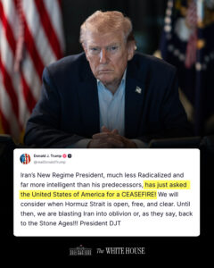 President Donald Trump has claimed that Iran’s new regime president has requested a ceasefire with the United States, describing the unnamed leader as less radicalised and more intelligent than his predecessors. The statement, shared through an official White House post, framed the alleged request as a sign that American military pressure is working. Trump conditioned any consideration of a ceasefire on the full reopening of the Strait of Hormuz to international shipping, a demand that ties any diplomatic progress directly to the restoration of global oil transit through the waterway.