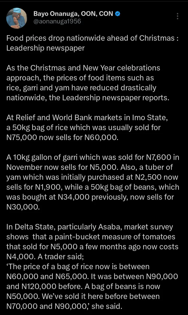 Bayo Onanuga Reacts As It Was Announced That Food Prices Have Dropped Ahead Of Christmas Celebrations