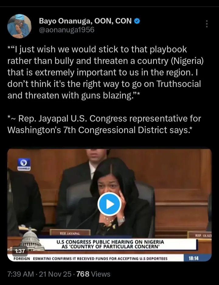 Bayo Onanuga, the senior special adviser on Information and Strategy has taken to his official X handle to react after a United States Congresswoman, Jayapal disclosed that Nigeria cannot be bullied or threatened. Her comments came following the controversial designation slammed on Nigeria by President Donald Trump.