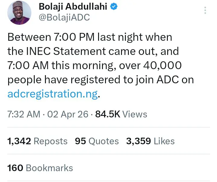 In his words: “From 7pm yesterday, when INEC issued its statement, to 7am today, over 40,000 people have enrolled as members of the ADC….See More