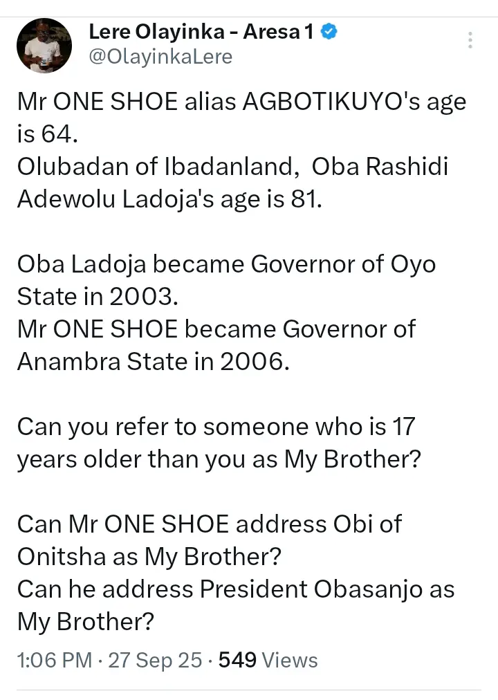 In a post via X, he argued that Oba Ladoja, who is 81 years old, is 17 years older than Obi, who is 64. According to Olayinka, it is unusual to call someone much older a brother. To him, such a title does not show the traditional respect usually given to elders in Nigerian culture.