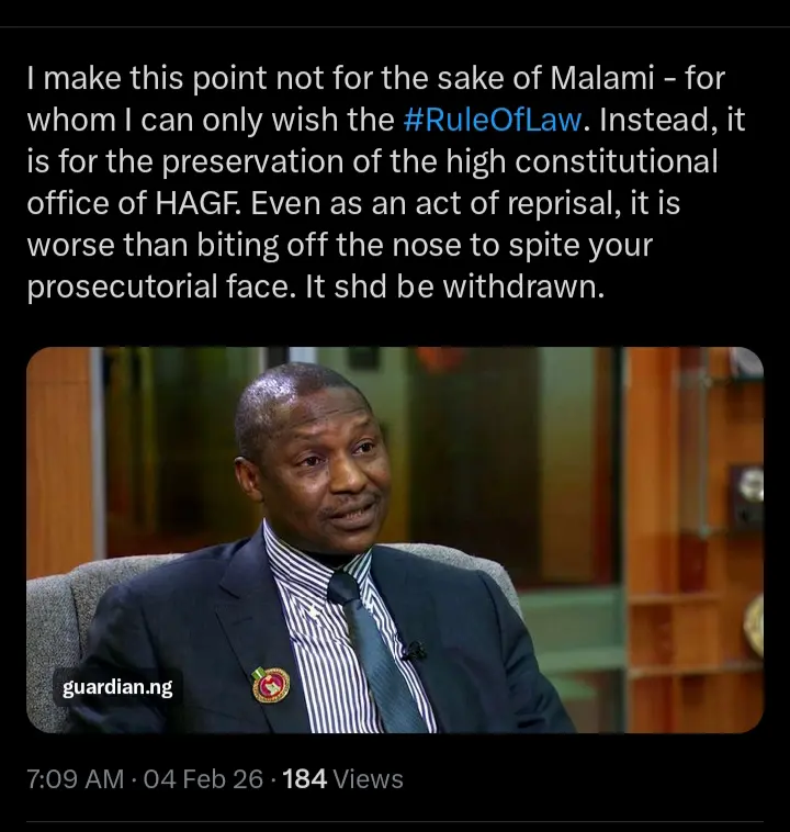 However, he pointed out that his advice to withdraw the charge was not born out of his likeness for Abubakar Malami, but for the preservation of the standards of the attorney general’s office.