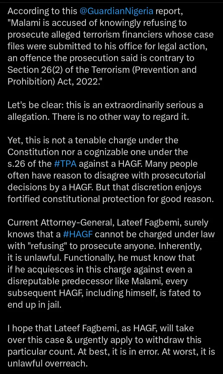 According to the statements which were shared on his official X handle, he pinpointed the dangers associated with the fresh charge, refusal to prosecute terrorism financiers whose case were brought before him while in office.