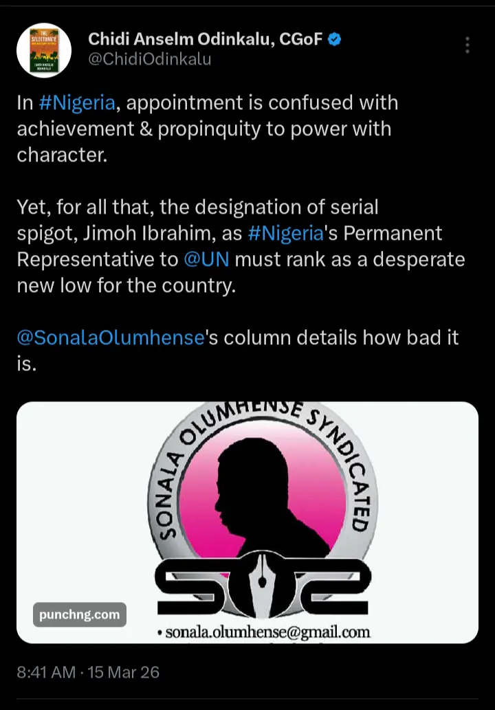The appointment of Jimoh Ibrahim, a popular business mogul and former federal lawmaker as the permanent representative to the United Nations generated mixed reactions as the posting was confirmed.