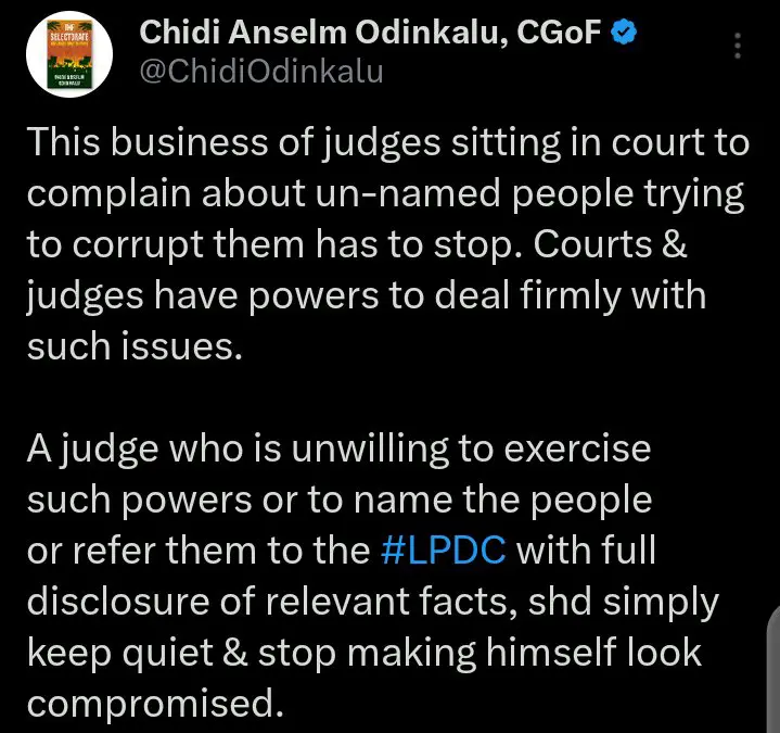 “This business of judges sitting in court to complain about un-named people trying to corrupt them has to stop,” Odinkalu wrote. “Courts and judges have powers to deal firmly with such issues.”