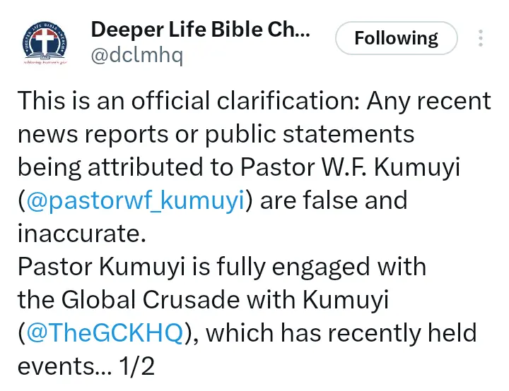 Deeper Life Bible Church has now reacted to the viral report. In the statement that surfaced, the church said the report is fake. The church said Pastor Kumuyi is fully engaged with Global Crusade and didn’t make such comment.