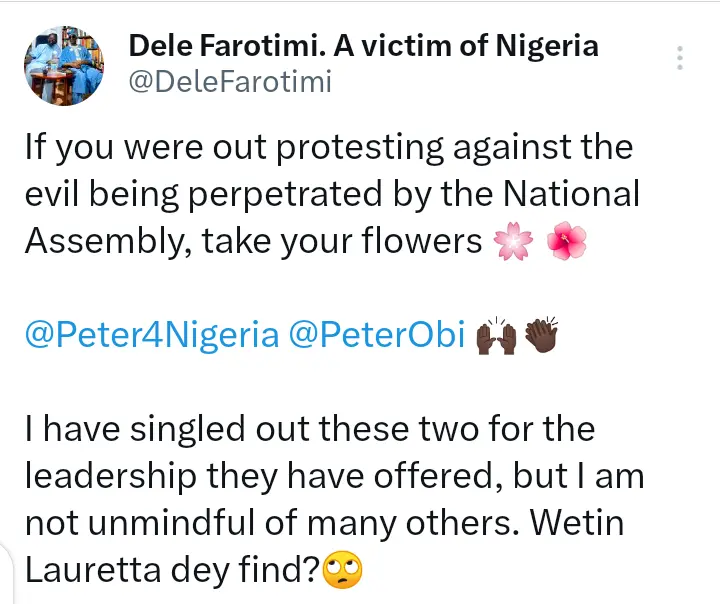 “If you were out protesting against the evil being perpetrated by the National Assembly, take your flowers Peter Obi.