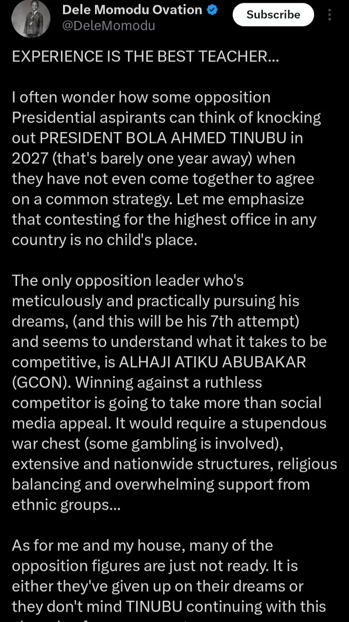 On Tuesday, veteran journalist and PDP chieftain Dele Momodu praised Atiku’s moves on X, describing him as the only opposition figure currently showing serious preparation for 2027.
