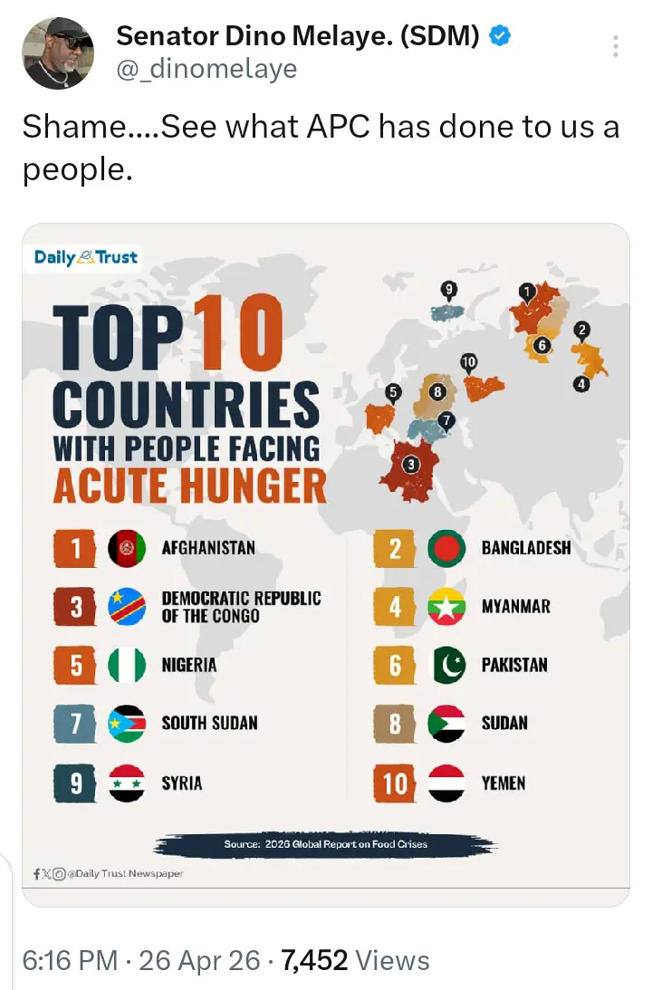 Former senator representing Kogi West and a prominent member of the African Democratic Congress (ADC), Dino Melaye, has reacted strongly to Nigeria’s inclusion on a list of countries facing severe hunger challenges across Africa.