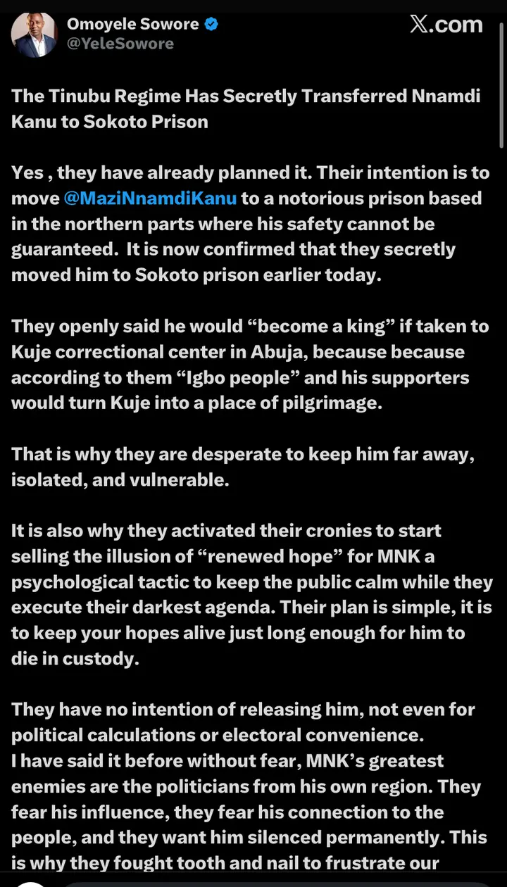 In the post, Sowore wrote: “The Tinubu Regime Has Secretly Transferred Nnamdi Kanu to Sokoto Prison.” He asserted that the development was not accidental, adding: “Yes, they have already planned it. Their intention is to move @MaziNnamdiKanu to a notorious prison based in the northern parts where his safety cannot be guaranteed. It is now confirmed that they secretly moved him to Sokoto prison earlier today.” Sowore alleged that authorities rejected suggestions to detain Kanu at Kuje Correctional Centre due to concerns about public attention. He stated: “They openly said he would ‘become a king’ if taken to Kuje correctional center in Abuja, because according to them ‘Igbo people’ and his supporters would turn Kuje into a place of pilgrimage.”