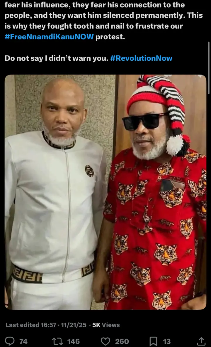 The activist also criticised politicians from Kanu’s region, suggesting they played a role in undermining efforts to secure his freedom. “I have said it before without fear, MNK’s greatest enemies are the politicians from his own region. They fear his influence, they fear his connection to the people, and they want him silenced permanently.” He recalled previous confrontations with the authorities, adding: “This is why they fought tooth and nail to frustrate our #FreeNnamdiKanuNOW protest.” Sowore concluded with a warning to his followers, stating: “Do not say I didn’t warn you. #RevolutionNow.”