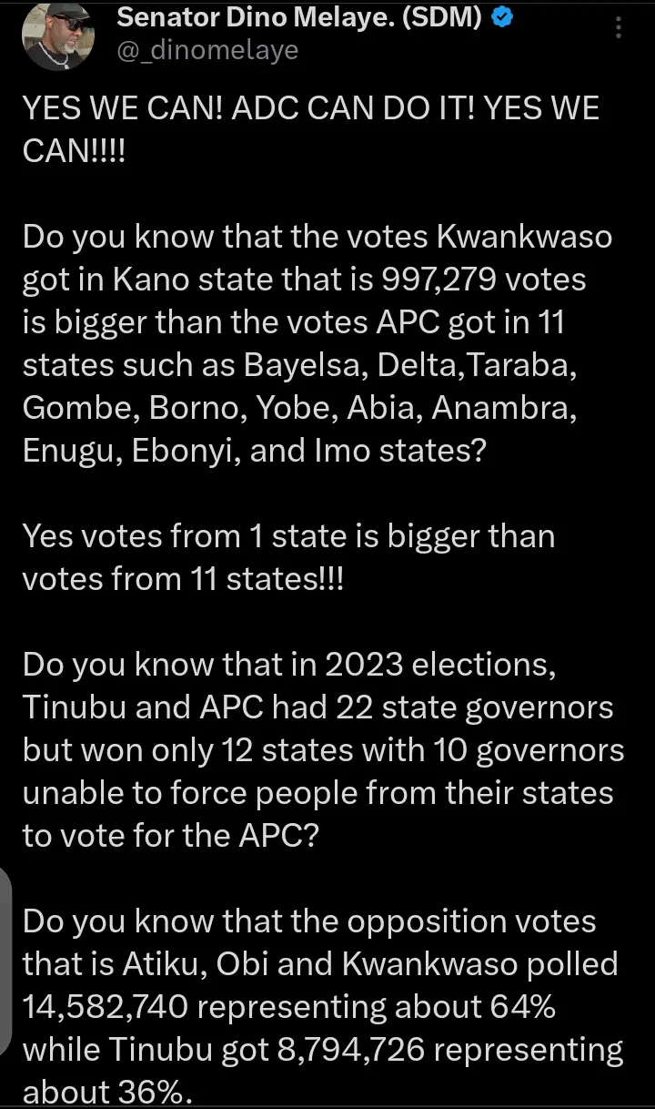 In the post that Dino Melaye shared on his page, he said in the last presidential election, the former governor of Kano state Rabiu Musa Kwankwaso got more votes in just one state than President Bola Ahmed Tinubu did in 11 states.