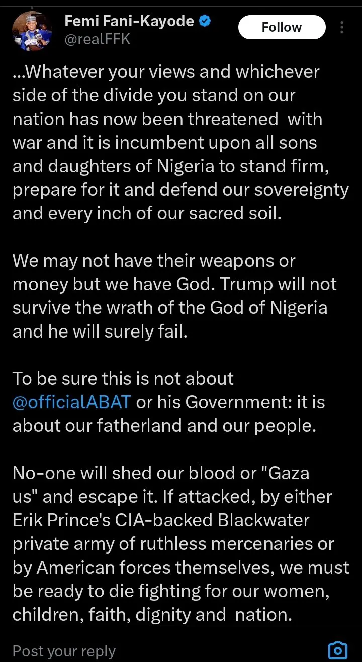 In an impassioned declaration, Fani-Kayode vowed that Nigerians would resist any attempt at external aggression. “They are evil, and if he carries out his abominable threat, there will be war. We shall not leave the country but will fight it out with them,” he said, emphasizing that the Nigerian people were neither powerless nor willing to be cowed by threats from abroad.