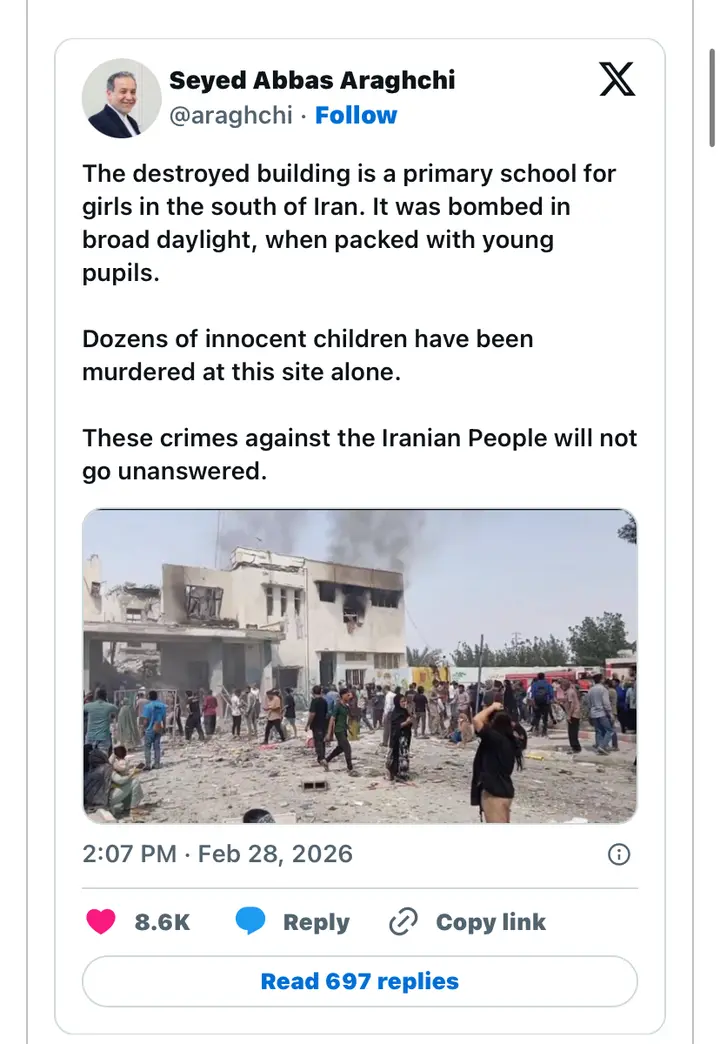 State media earlier reported the death toll at the Minab school in Hormozgan province rose to 53 students which are all young girls with rescue efforts ongoing. Araghchi’s post aligns with his prior statement to IRNA that the attack on Iran’s narrative of unprovoked aggression by Israel and the United States.