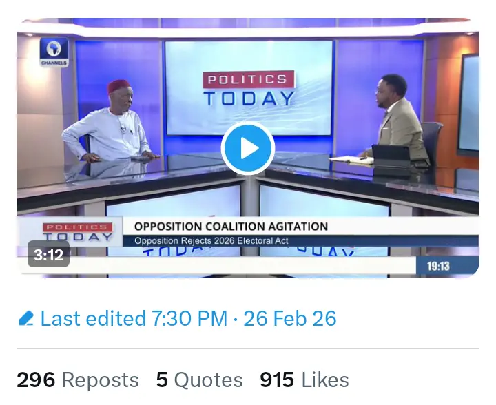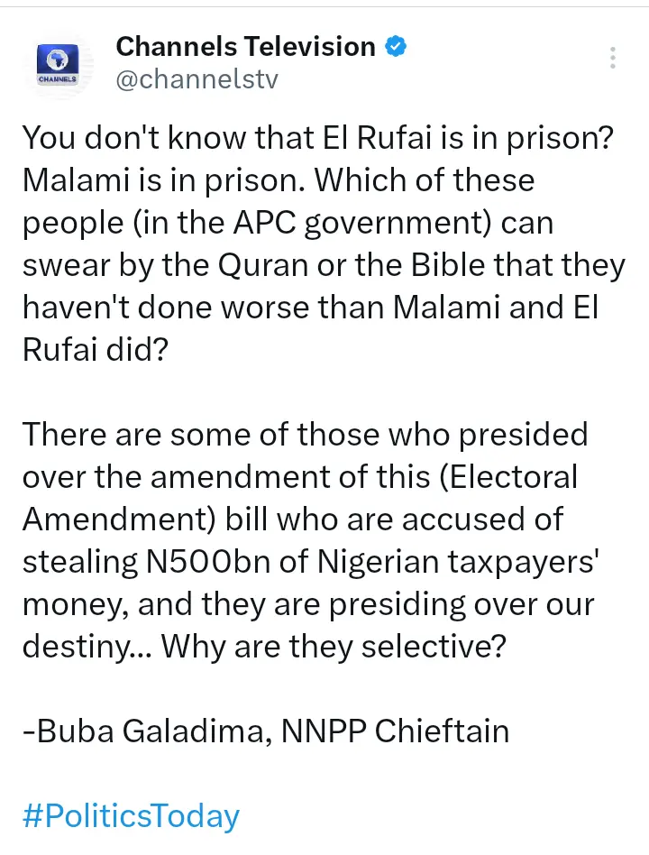 The statement of Buba Galadima was contained in a post that Channels TV shared on its official X handle on Thursday, February 26, 2026.