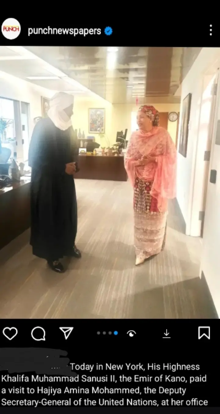 According to Punch Newspaper, the Emir of Kano, His Highness Muhammad Sanusi, paid an official visit to the United Nations Deputy Secretary-General, Amina J. Muhammad, at her office in New York on Sunday, 28th September, 2025.