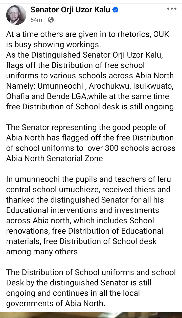 The Senator’s distribution of uniforms and school desks is ongoing, reaching schools in all local governments across Abia North.
