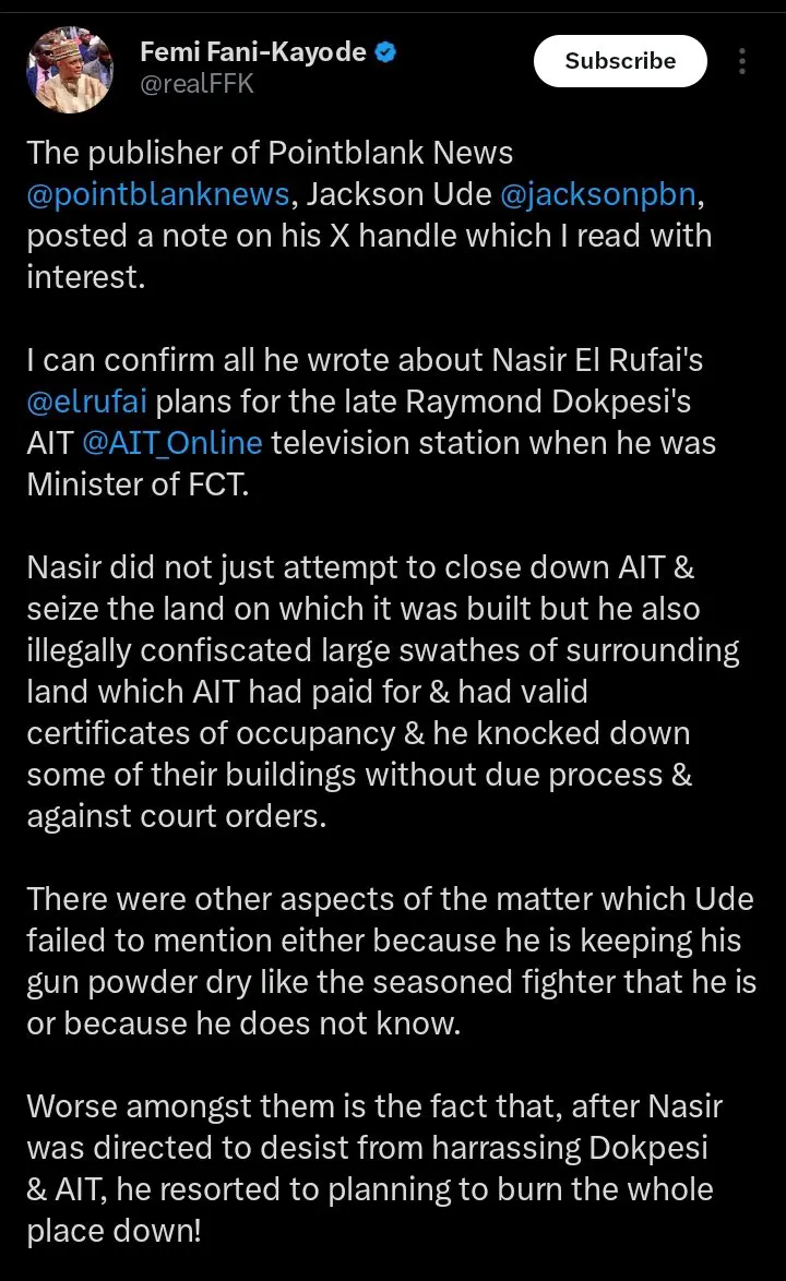 Fani-Kayode specifically referenced the late media entrepreneur Raymond Dokpesi, founder of Daar Communications, which operates African Independent Television. He alleged that El-Rufai not only attempted to shut down the television station but also planned to burn down its premises as part of efforts to assert authority and silence opposition.