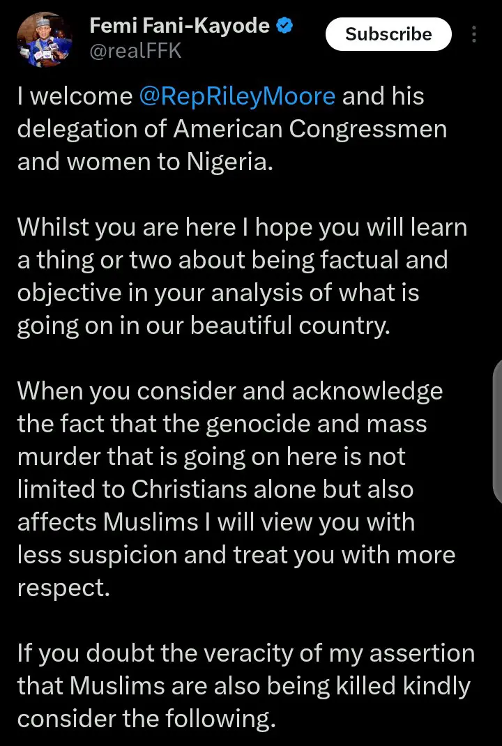 In his post, Fani-Kayode extended a warm welcome to the visiting lawmakers. He urged them to inform President Trump that there is no ongoing genocide in Nigeria, stressing that the violence affecting communities cuts across both Christian and Muslim populations.