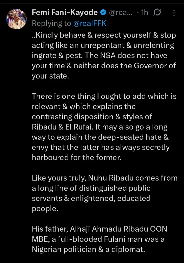 Fani-Kayode said, “Kindly behave & respect yourself & stop acting like an unrepentant & unrelenting ingrate & pest. The NSA does not have your time & neither does the Governor of your state. There is one thing I ought to add which is relevant & which explains the contrasting disposition & styles of Ribadu & El Rufai. It may also go a long way to explain the deep-seated hate & envy that the latter has always secretly harboured for the former.”