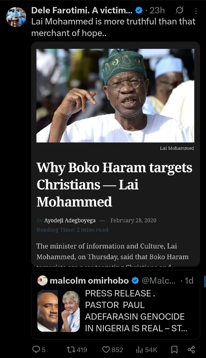 In a post shared on his official X handle, Farotimi reposted a 2020 publication by Premium Times in which Lai Mohammed stated that Boko Haram deliberately attacked Christians to spark a religious conflict and sow division between Muslims and Christians in the country.