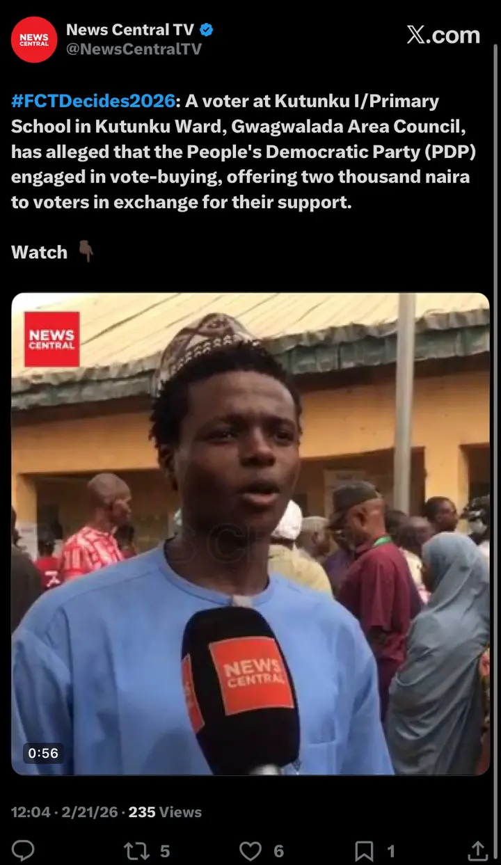 According to a report by News Central TV on Saturday, February 21, 2026, a voter at Kutunku I Primary School in Kutunku Ward, Gwagwalada Area Council, has alleged inducement of voters during the ongoing Federal Capital Territory Area Council elections.