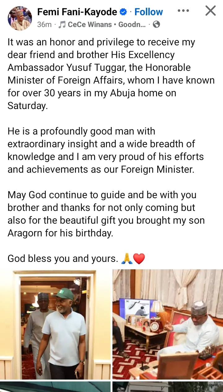 Fani-Kayode further expressed gratitude to the Foreign Affairs Minister for the visit and for the thoughtful birthday gift presented to his son, Aragorn.