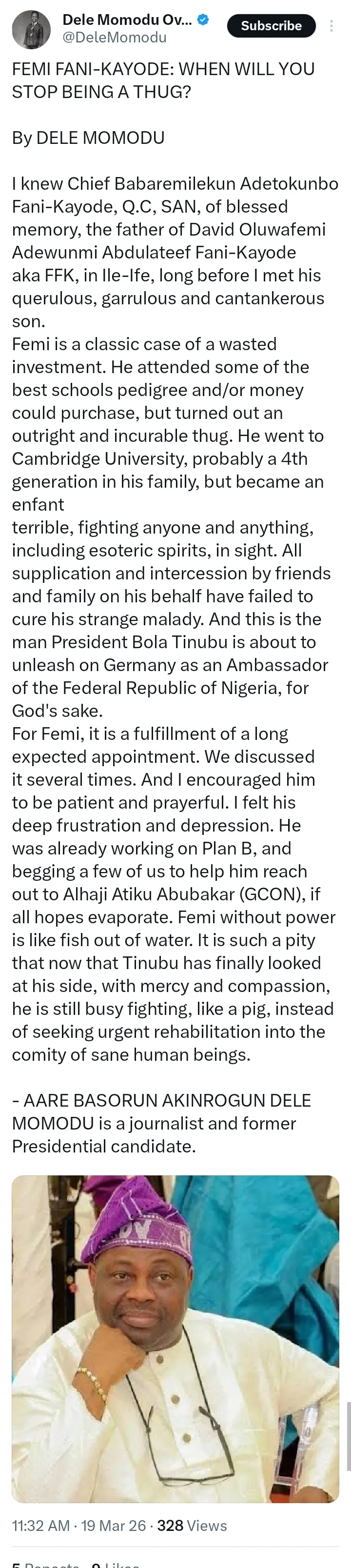 He also pointed out that Fani-Kayode strongly desires to remain relevant in politics and struggles when he is not in a position of influence. Momodu described this as a major reason behind his actions and decisions over time.