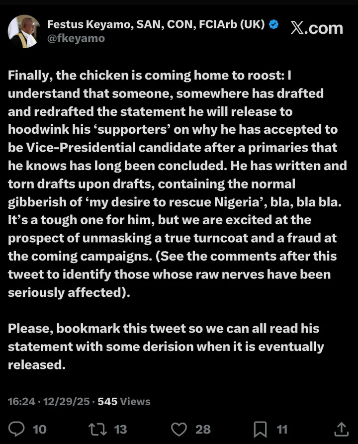 In a widely circulated post on X (formerly Twitter) on Monday, December 29, 2025, Keyamo wrote: “Finally, the chicken is coming home to roost: I understand that someone, somewhere has drafted and redrafted the statement he will release to hoodwink his ‘supporters’ on why he has accepted to be Vice-Presidential candidate after a primaries that he knows has long been concluded.”