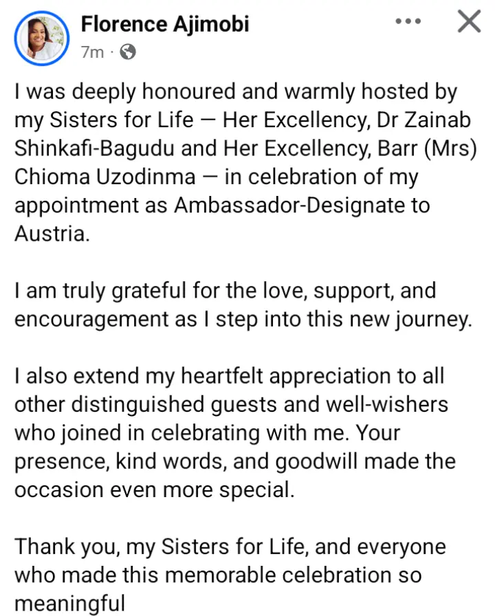 The former First Lady of Oyo State, Florence Ajimobi stated on her verified Facebook page on Monday; “I was deeply honoured and warmly hosted by my Sisters for Life — Her Excellency, Dr Zainab Shinkafi-Bagudu and Her Excellency, Barr (Mrs) Chioma Uzodinma — in celebration of my appointment as Ambassador-Designate to Austria.”