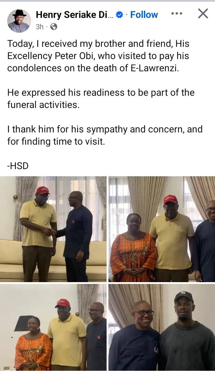 According to a media post by Senator Henry Seriake Dickson on Wednesday, 17 December 2025, former Labour Party presidential candidate, His Excellency Peter Obi, paid a condolence visit to him at his residence following the passing of E-Lawrenzi.