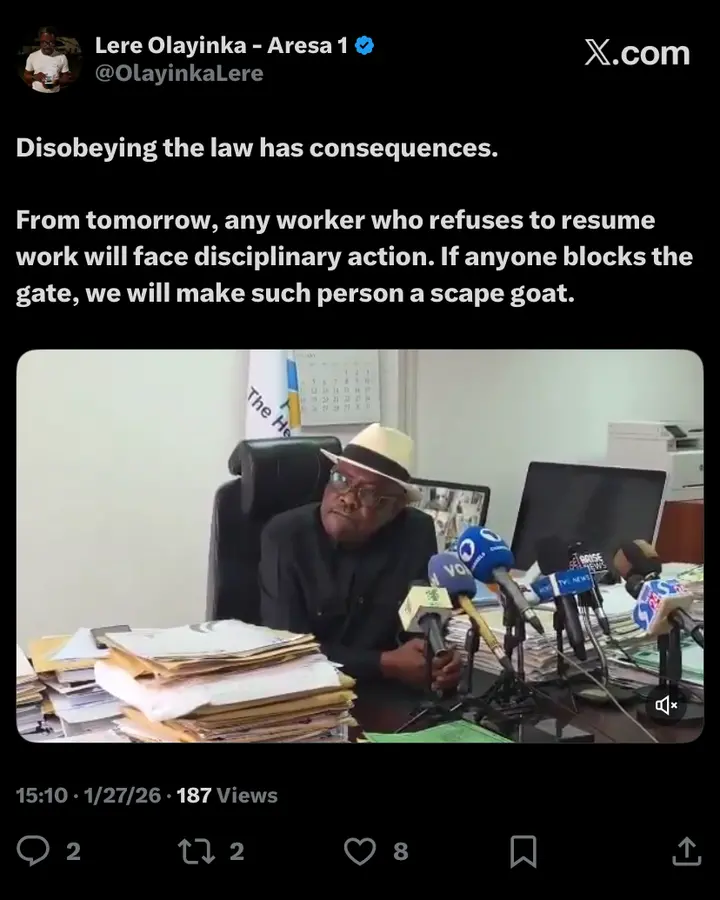 Wike made the remarks in a video shared by his aide, Lere Olayinka, on X on Tuesday, January 27, 2026, following the ruling of the National Industrial Court of Nigeria which ordered workers under the Joint Unions Action Committee (JUAC) to suspend their industrial action.